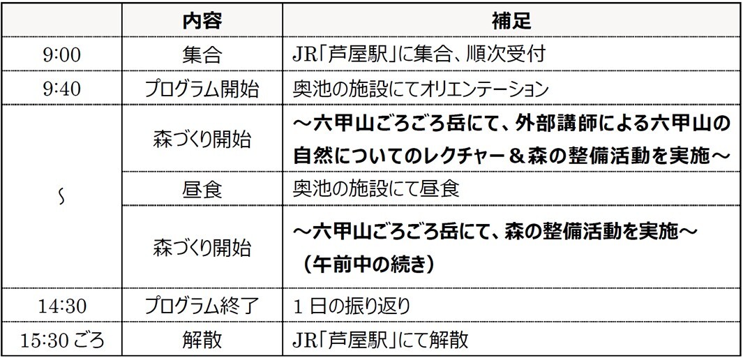 本活動は、国土交通省が阪神・淡路大震災の復興を目的として1996年に開始し、今年で30年の節目を迎える「六甲山系グリーンベルト整備事業」の一環となる取り組みです。六甲山系の自然を未来へ引き継ぐため、親子で共に六甲山の森づくりを担う“当事者”として関わることで、土砂災害を防ぐ森を守り育て、環境保全の意識と地域の記憶を次の世代へつないでいきます。