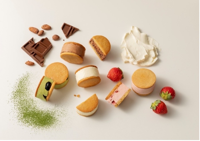 サクサククッキー生地がふわっと軽やかなバターチーズクリームを挟んだ、当店の名物商品です。コク深くも柔らかな甘みのクリームと、塩味の効いたクッキーが見事に調和した、ついついやみつきになってしまうスイーツに仕上げました。フレーバーは「クリームチーズ」、「ベリーチーズ」、「ショコラチーズ」、「抹茶黒豆」の4種類をご用意。ベリーチーズには自社直営コモレビ農園のいちごを使用しております。