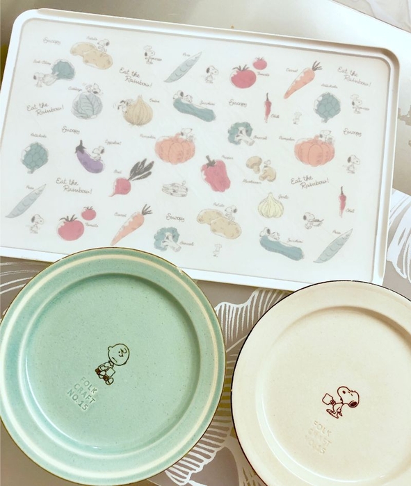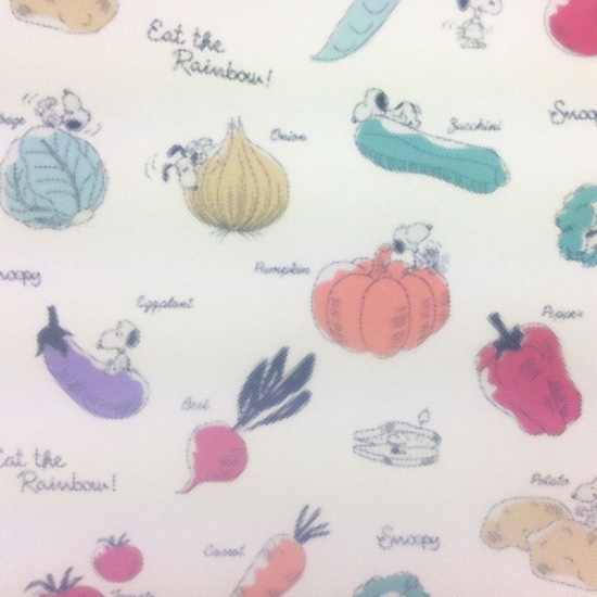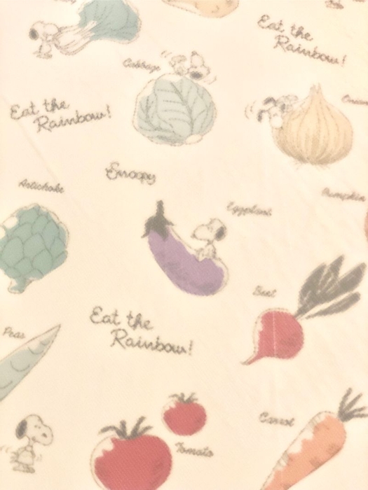 しっかりと使いこめるスグレモノスヌーピー。1枚1700円程度でお値段も手頃です。ヒットの理由、2色買う人のわけ、納得してしまいました。それぞれのスヌーピーがかわいくて、最後にまとめてアップでご紹介します。ポーチなど、他のアイテムに使われていないベジタブルアートが素敵です。