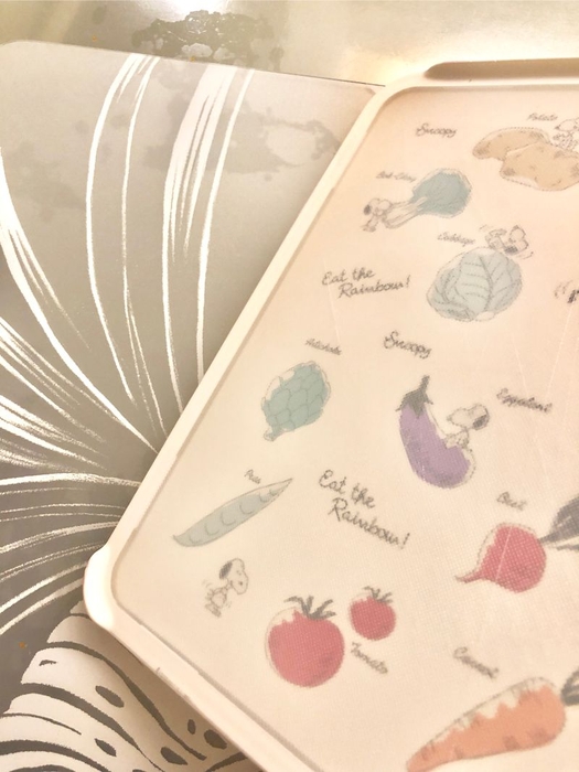 ホワイトとブラウンの2種類があります。どちらもベジタブル柄。個人的には食べ物が明るく見えるホワイトが好みです。