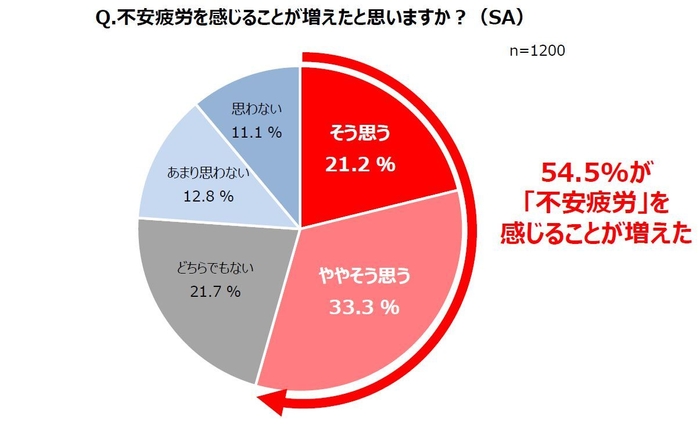 - コロナ禍で「不安疲労」が増えたと感じる人が54.5%と半数を超える。男女別では、女性の6割が「不安疲労」が増えたと自覚。