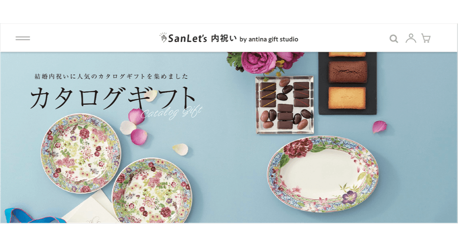 カタログギフトメーカーの大和とコラボレーションしてできた「SanLet's」専用ギフトサイトは、カタログギフトのみならず、おしゃれな雑貨やグルメなども充実しています。参列サイトにある、新郎新婦のプロフィールの質問を参考にお二人の好みを反映して、喜ばれるギフトを選ぶことができます。カタログギフトならテーマだけを贈る側が選び、商品は新郎新婦が好きなものを選べるので、ほかの参列者とかぶることもありません。