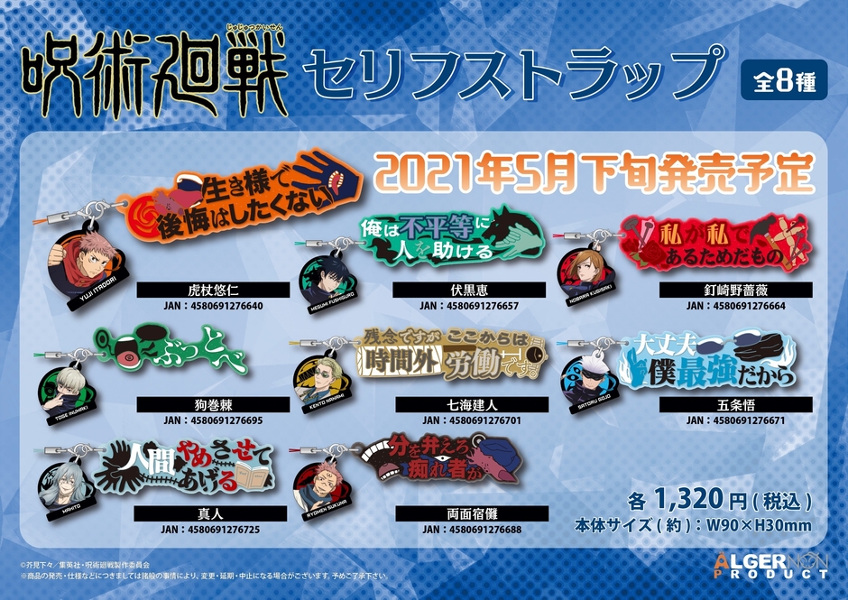 株式会社アルジャーノンプロダクト(本社:東京都台東区、代表取締役社長:高山 聡士)は、TVアニメ放送中の「呪術廻戦」より、アニメに登場する個性あふれるセリフがラバーストラップとなった《セリフストラップ》を発売いたします。