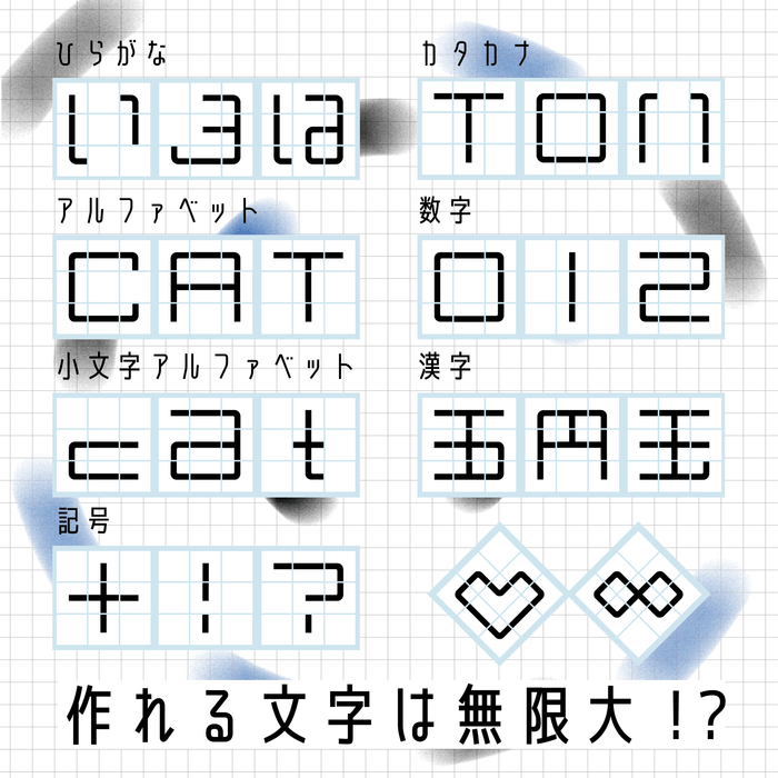作りたい文字をイメージして作り始めても、動かしているうちに何か別の文字にめぐり合う可能性が高いというのも、モジキューブの面白さです。偶然の出会いが新しい文字のひらめきにつながるのかもしれません。