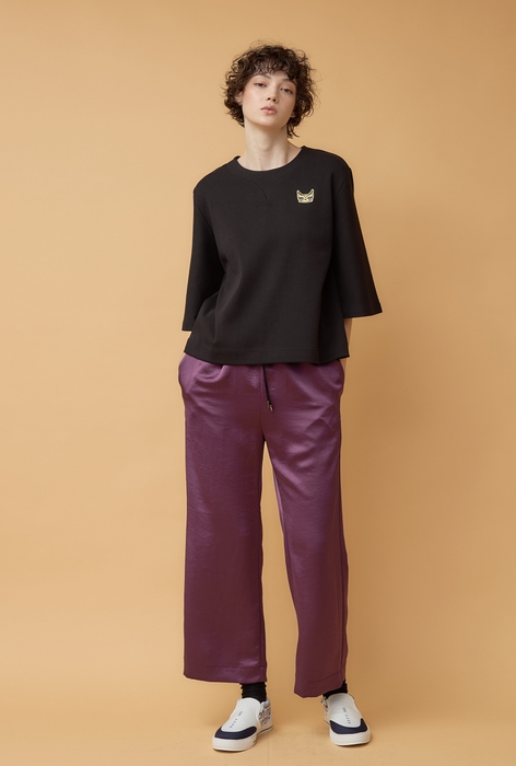 独特のコットンの光沢とやや重厚感もある上質なコットン100%フライス素材を使用したトップス。1枚で着やすいトップスは秋の入り口に適した素材感