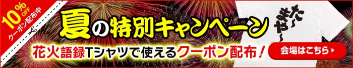 夏本番に向けて、7月5日から先着100注文に、花火Tシャツを通常価格より10%オフになるクーポンを配布いたします。この機会に、ご自宅用はもちろん、ギフト用としてもぴったりなTシャツをお求めください。
