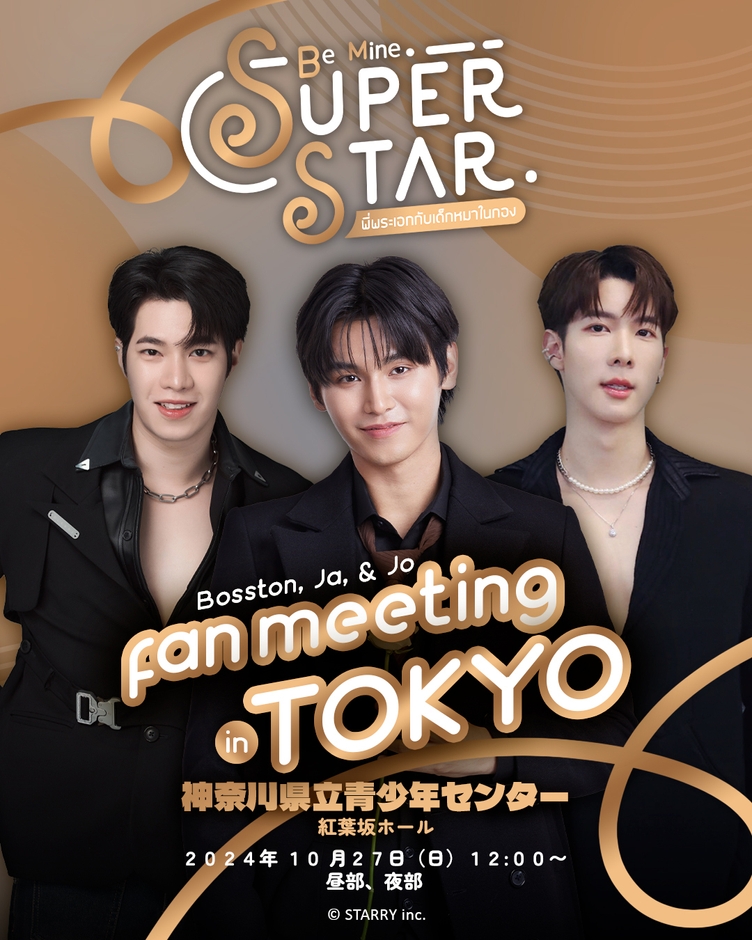 日本で高い人気を誇るタイBLドラマの中でも現在話題の「Be Mine. Superstar」公式ファンミーティング開催(2部制)が決定しました。ドラマ出演者3人 Ja(PHACHARA SUANSRI(パチャラ・スアンシー)), Jo(KAVINPAT THANAHIRANSILP(カウィンパット・タナヒランシン)), Bosston(SUPHADACH VILAIRAT(スパダック・ウィライラット))が参加する今回のファンミーティングは、出演者と身近に過ごすことができるファンにとっての貴重な機会を提供できる豪華内容となります。