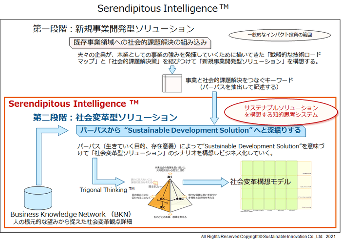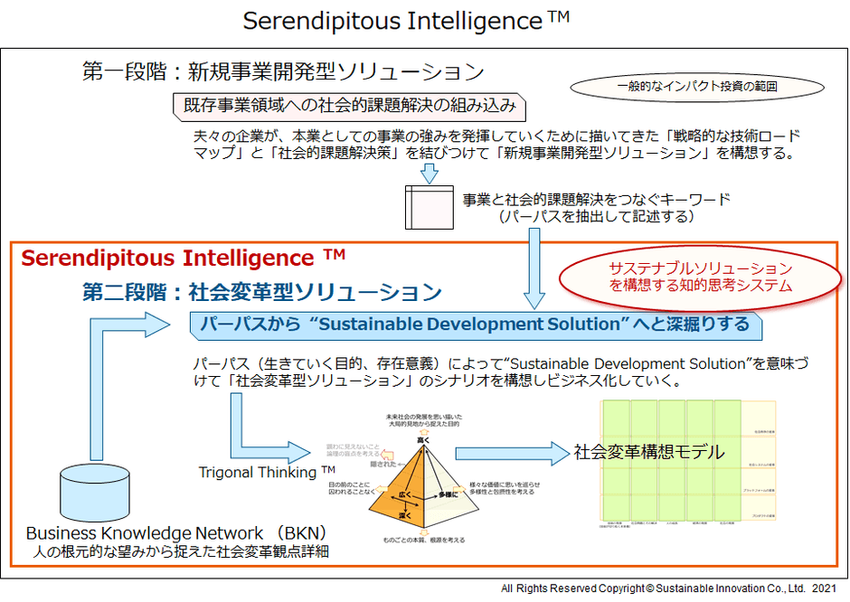 『Serendipitous Intelligence(TM)システム』は、当社が開発した思考方法論“Trigonal Thinking(TM)”を用いて『社会変革型ソリューション』を構想していくための支援システムです。