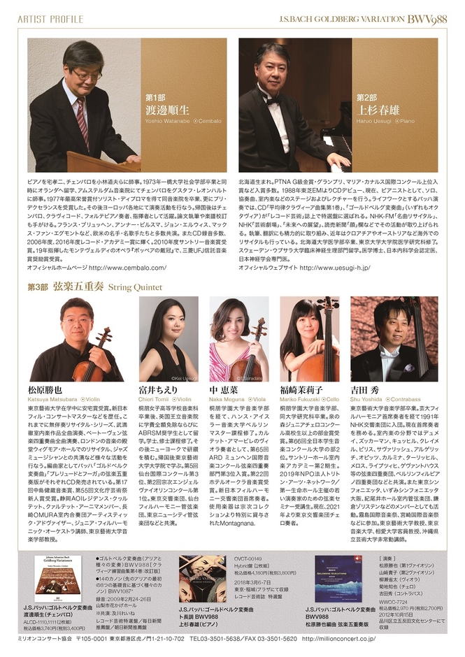 コンサートは全3部で構成され、第1部はオリジナルの二段チェンバロ、第2部は現代のピアノ、第3部は弦楽五重奏版により、それぞれの分野で考え得る最高の『ゴルトベルク変奏曲』の一日をお届けします。