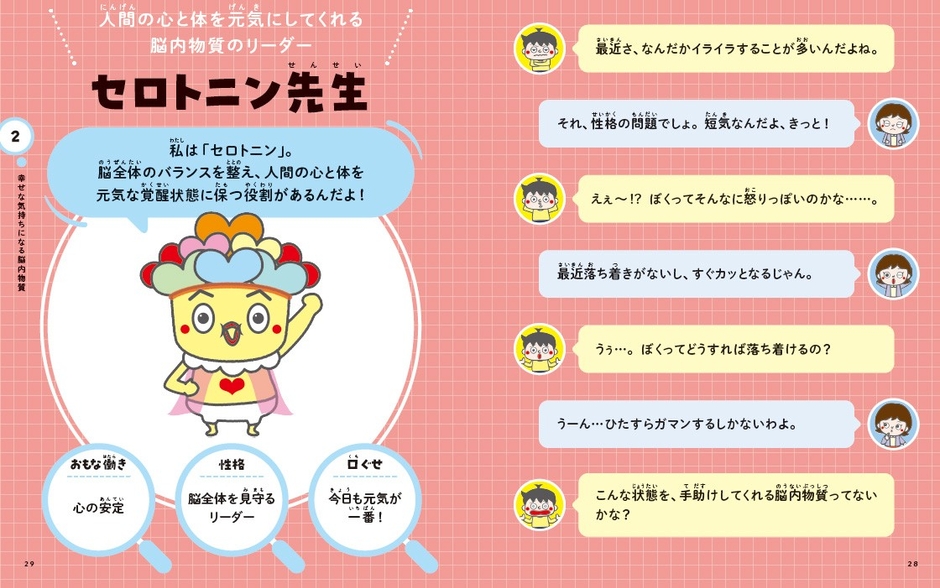 「幸せを呼ぶリーダー・セロトニン先生」「やる気スイッチを押す・ドーパミン王」「集中力を高める・ノルアドレナリン殿」など、13種類の脳内物質がキャラクターとして登場。難しい脳科学の話も、イラスト付きなので、スッと頭に入ります。個性豊かで魅力的なキャラクターは、『キャラ絵で学ぶ!』シリーズ(すばる舎)、『キャラクター図鑑』シリーズ(日本図書センター)などでおなじみの人気イラストレーター・いとうみつる氏が描き下ろしました。