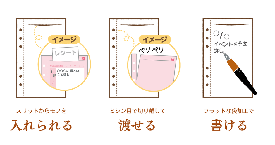 通常のダイアリーなどとしてお使いいただけます。ページが袋状になっているので、ちょっとしたものを手渡しする際に、システム手帳から切り離し、ポチ袋として使えます。レシート・メモ・チケットを手帳に挟んだり、貼ったりせずに、袋部分に入れて収納する使い方もできます。