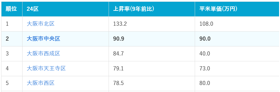 大阪市24区における9年前との上昇率をランキング形式で紹介します。