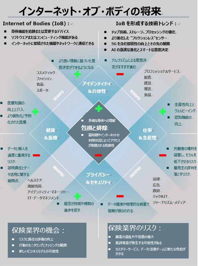 「IoBがもたらす影響は明らかだ。プライバシーとデータに関する問題やIoBが生み出す膨大なデータの管理などが伴うが、IoBの将来をより広く見渡すと、保険業界においてはもっと意外な問題も明らかになった。たとえば、顧客を混乱させたり、特定の顧客を差別したりするような現実的なリスクがある。しかし、高齢へのウェルビーイングの保証や新たな事業分野を開拓するチャンスもある」。