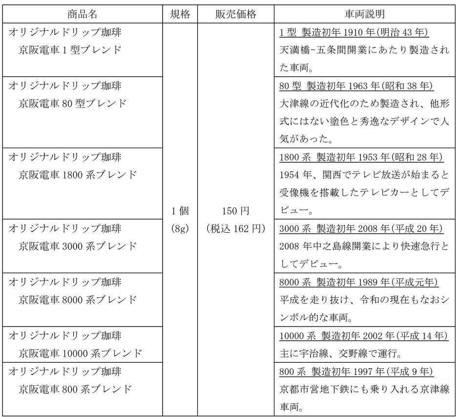 「オリジナルドリップ珈琲 京阪電車ブレンド」新発売! ~往年の名車両から現役車両まで、計7種類を10月11日(月)より発売~