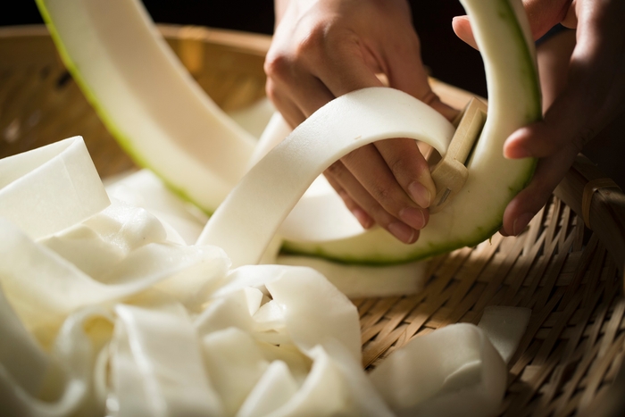 手カンナを使って本物の夕顔の実を剥き、かんぴょう作りの一部を体験することができます。長くきれいなかんぴょうに仕上げるには、絶妙な力加減とコツが必要です。夕顔の農家から剥き方のレクチャーを受けたスタッフの手ほどきで夕顔の実を剥き、剥いたかんぴょうの長さを競って盛り上がります。
