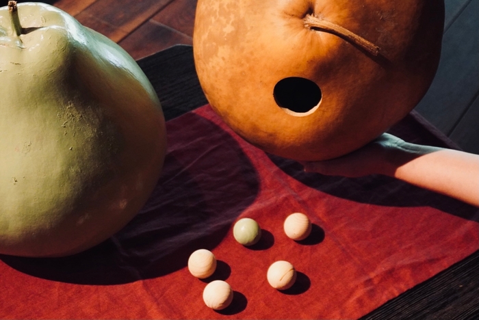 夕顔の実をくり抜いて乾燥させた「ふくべ」を使い、運試しを楽しむことができます。夕顔の実は乾燥させるととても固く、木のような質感に変わります。「ふくべ」の中に木の玉を入れ、おみくじ箱のようにがらがらと振ると木の玉が1つ出てきます。木の玉が夕顔の実と同じ緑色が出たら大当たりです。