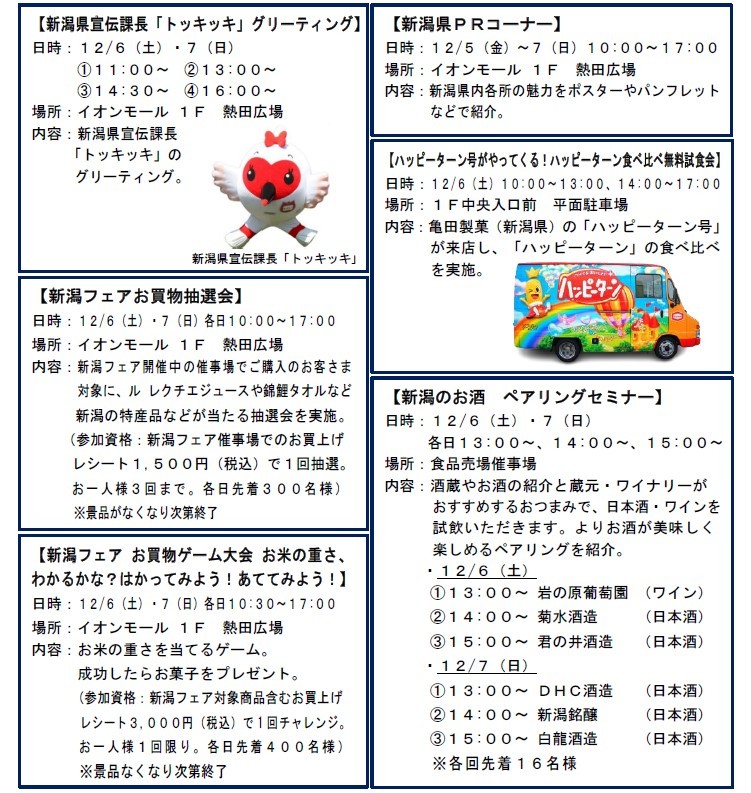 イオンリテール中部カンパニーは、12月5日(金)~7日(日)の3日間、イオンスタイル 熱田(名古屋市熱田区)にて、新潟県の魅力ある食と文化を発信する「新潟フェア」(以下、当フェア)を開催します。