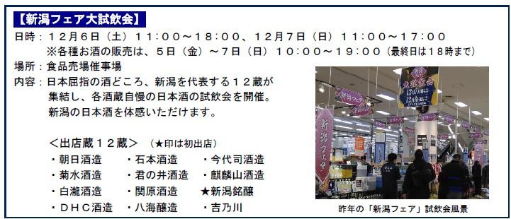 【新潟フェア大試飲会】 日時:12月6日(土)11:00~18:00、12月7日(日)11:00~17:00