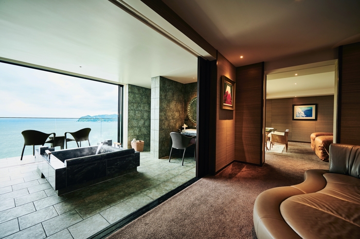 かつて別荘だった建物には、人が住まう家ならではのよく考えられた機能美や、上質な建材の時を経た美しさと柔らかさがあります。一方、増築部分の客室はモダンな洋で設えられ、居室と、海を望む開放的な窓の間に配された半露天温泉風呂が、一瞬のうちに非日常へと誘ってくれます。「寛げる空間とは」を考え抜いた上で、ひとつひとつの家具や絵が配置されていることで、歴史ある和とモダンな洋が、違和感なく繋がっています。