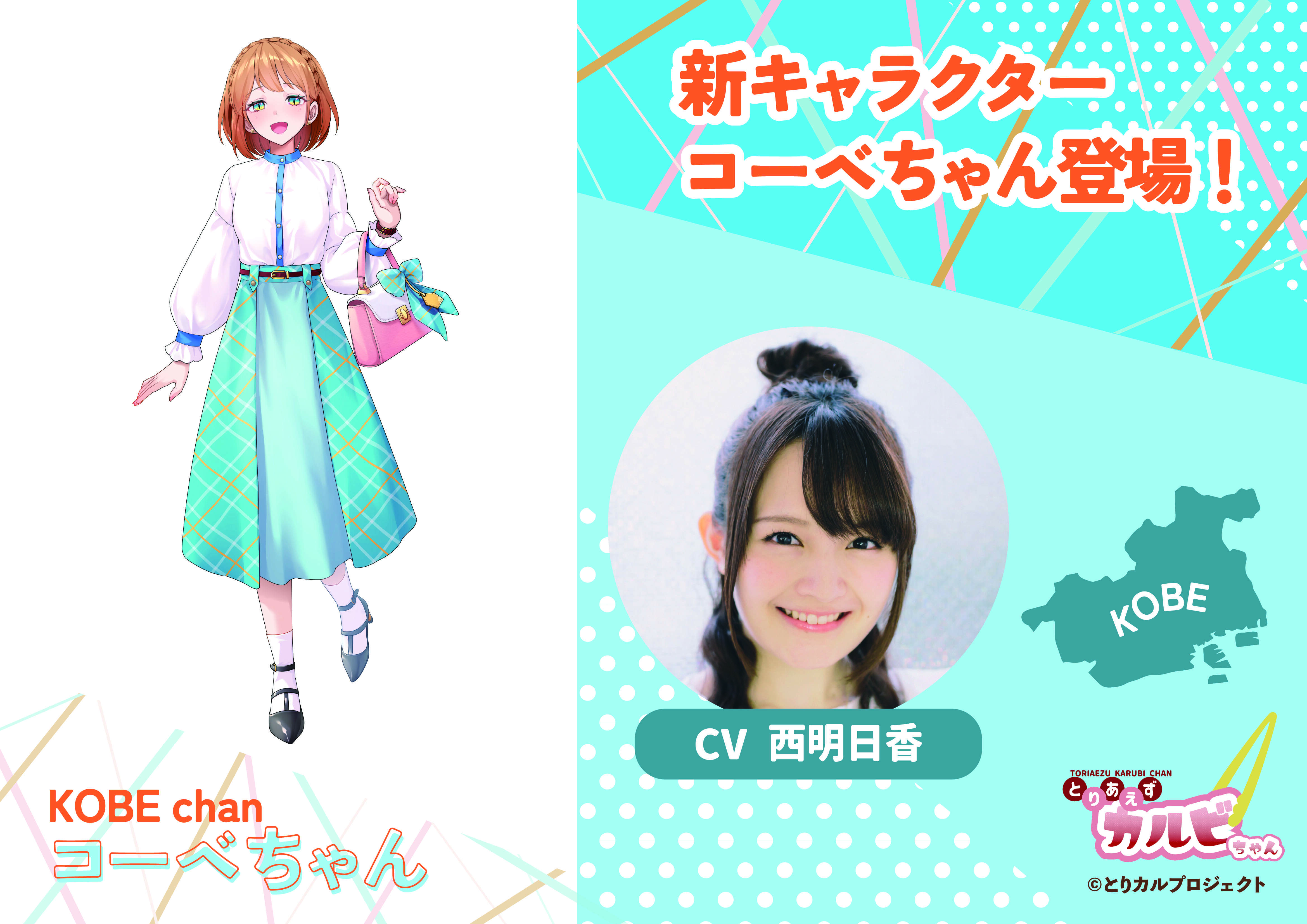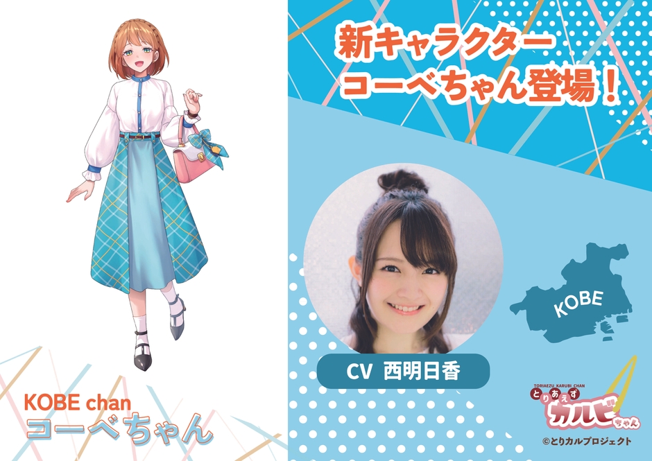 株式会社WPS(本社:大阪市西区、代表取締役:吉本 敬史)は、同社が展開する産業創生型クロスメディアプロジェクト『とりあえずカルビちゃん(とりカル)』において、兵庫県・神戸エリア出身の新キャラクター「コーベちゃん」を公開いたしました。また、キャラクターボイス(CV)には、地元・兵庫県出身の声優、西明日香さんの起用が決定したことをお知らせいたします。