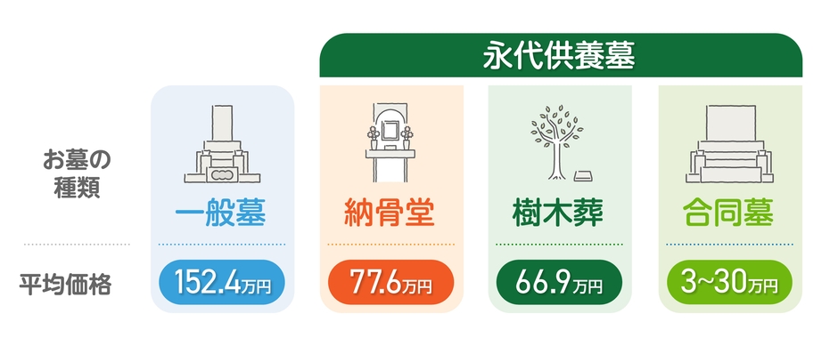 現代のお墓は、伝統的な墓地から革新的な供養方法まで大きく4つのタイプがあり、平均価格は以下の通りです。※1、※2