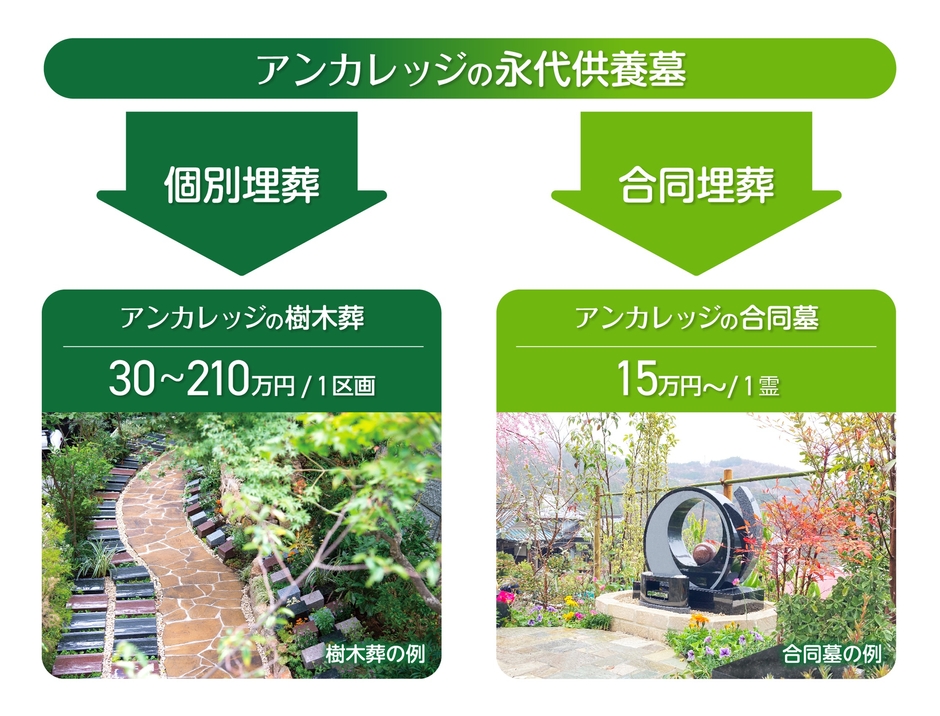 アンカレッジの樹木葬には「1人用」「1~2人用」「1~4人用」の3つのタイプがあります。収容人数や墓石のサイズ、デザインによって金額が異なります。個別に埋葬するタイプですが、一般墓よりも費用は手頃です。墓石もコンパクトで、メンテナンスが簡単です。 ご利用者(納骨予定者)全員が亡くなった後、最初の13年間は個別の樹木葬で埋葬。その後、合同墓での供養を行います。(最長33年に延長可能なタイプもある)