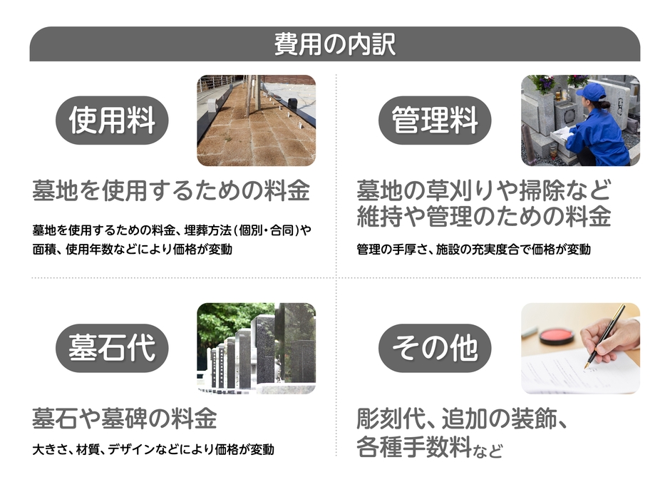 お墓の費用は、以下のような内訳から成り立ち、様々な要因により価格が変動します。