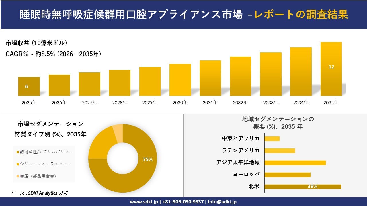 提出日 (2026年02月05)、SDKI Analytics(本社:渋谷区、東京都)は、2026年と2035年の予測期間を対象とした「睡眠時無呼吸症候群用口腔アプライアンス市場」に関する調査を実施しました。