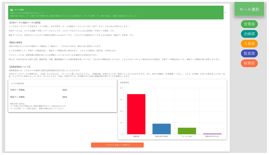 下記の3つの機能それぞれについて、5つの部門で使われると想定されるサンプルデータを使うことができます。また、自社データもアップロードすることができます。AIダッシュボードでは、お客様のデータは取得することはありませんので安心して使っていただくことが出来ます。