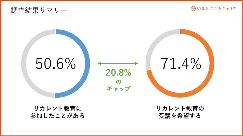 ・一方で、「リカレント教育に参加したことがある」と回答した方は50.6%となっており、受講希望者数と受講経験者数とのギャップが20.8%あります。