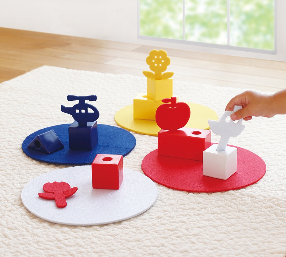 4つの色のつみきとフェルトで、色と形を識別する力を育てます。つみき遊びのほか、色ごと、形ごとに分類して遊んだり、見立て遊びやごっこ遊びなど成長に合わせて様々な遊びを楽しむことも。