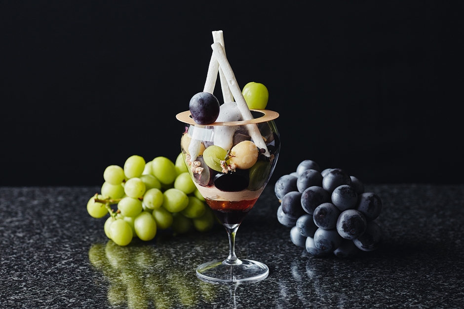旬のフルーツを目と舌で味わえると人気の大人のためのパフェシリーズ。贅沢に盛り合わせたシャインマスカットや巨峰をはじめ、巨峰のソルベやラムレーズンのアイスクリーム、濃厚なアーモンドガナッシュ、アクセントとなる塩クランブルなどが美しく層を成し、食べ進めるたびに変化する食感や味わいをお楽しみいただけます。赤・白・ロゼ 3種のワインの芳醇な香りを活かしたゼリーやメレンゲを忍ばせ、大人の味わいに仕上げたのも特徴です。