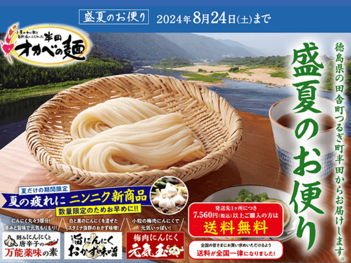 半田そうめんの製造販売をおこなう、株式会社オカベ(本社:徳島県美馬郡つるぎ町、代表取締役:岡部 洋史)は、会員様限定の盛夏のお便りを発刊しました。こちらのお便りでは、8月24日(土)までの期間中に、発送先1ヶ所につき商品合計7,560円(税込)以上ご購入の方は送料無料でお届けいたします。オカベの公式サイト上「盛夏のお便りページ」からもお買い求めいただけます。会員登録は今からでも間に合いますので、ぜひこの機会にご利用くださいませ。