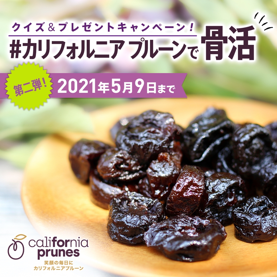 豊富な食物繊維とともに、さまざまなビタミンやミネラル類も多く含むソリューションフードのひとつ、カリフォルニア プルーン。カリフォルニア プルーン協会は、骨の健康にも役立つカリフォルニア プルーンの栄養や健康効果についてお伝えし、今月登場した新感覚のプルーンヘルシースナック「ドライピクルス カリフォルニアプルーン」を体験していただくクイズ&プレゼントキャンペーンを行います。