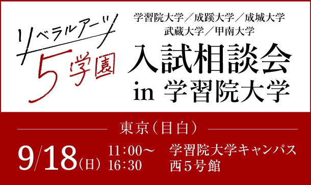 学習院大学・成蹊大学・成城大学・武蔵大学・甲南大学の5大学で構成される「リベラルアーツ5学園」は、旧制高等学校をルーツに持ち、現在も総合的な人間力を養うリベラルアーツ教育を実践しているのが特長です。この5学園が、2022年9月18日(日)、学習院大学にて「リベラルアーツ5学園 入試相談会 in 学習院大学」を開催します。