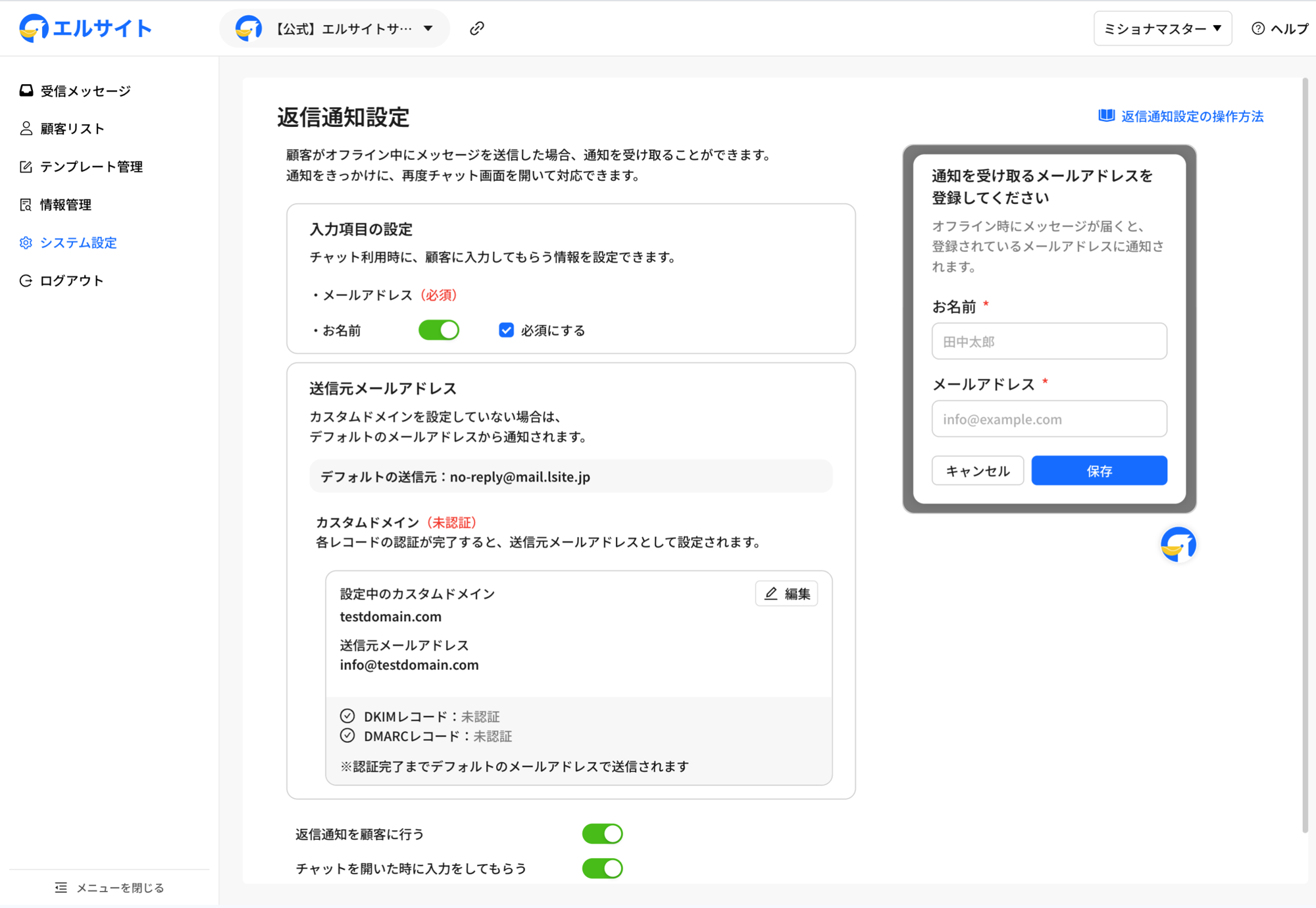 - 左メニューから「システム設定」>「返信通知設定」を開く