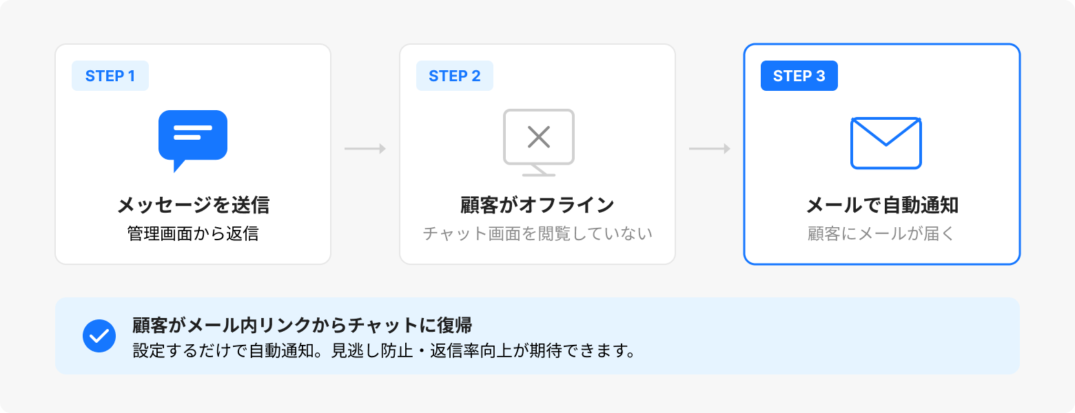 本機能は、顧客がチャット画面を閉じている状態でもメッセージの見逃しを防ぐことを目的としています。これにより、事業者と顧客のコミュニケーションがよりスムーズになり、対応の遅れや機会損失の防止につながります。