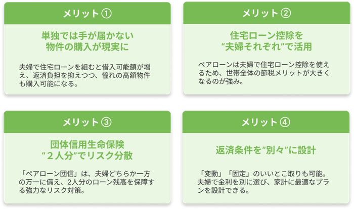 • ペアローン:同じ物件に対して夫婦それぞれが別々に住宅ローンを契約する方法。