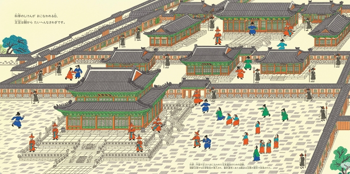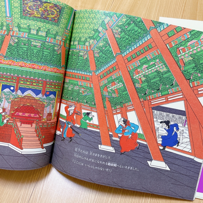 姿を消してしまった世宗大王がどこかで様子をみています。どこにいるのか探して楽しむことができる絵本です。