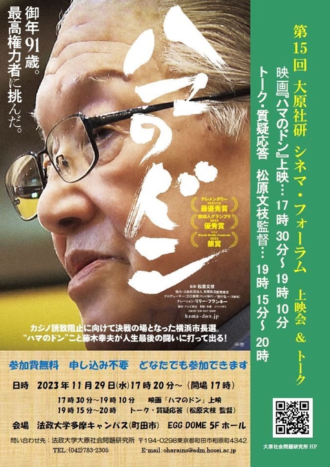 法政大学大原社会問題研究所では、2023年11月29日(水)に法政大学多摩キャンパス(東京都町田市)で第15回大原社研シネマ・フォーラム「ハマのドン」を開催します(参加費無料、事前申込不要)。上映後に、松原文枝氏(「ハマのドン」監督)によるトークも行われます。