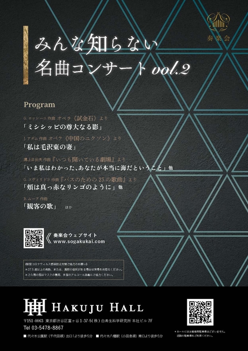 日本では知られていないけれど世界各地ではとてもポピュラー。そんな声楽の名曲を集め、日本ではまず聴くことのない曲を演奏する『みんな知らない名曲コンサート』。好評の昨年に引き続き、今年もハクジュ・ホールで開催いたします。そのクオリティの高さは格式あるハクジュ・ホールも認めるもの*。「東京ライブステージ応援助成」の助成もいただき、華やかに開催いたします。