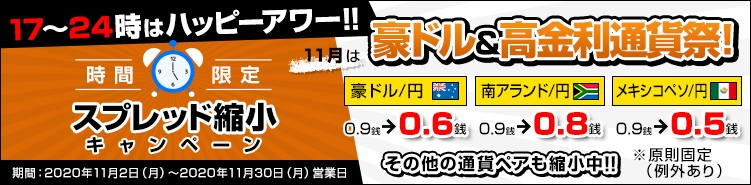 FXプライムbyGMO、 時間限定のスプレッド縮小キャンペーンを開始! 11月は豪ドル&高金利通貨でハッピーアワー! ~値動きが活発となる17時~24時でスプレッド縮小です~
