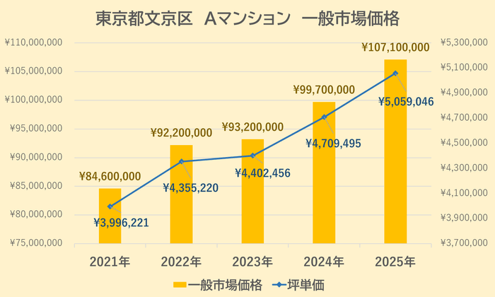 Aマンションの一般市場価格・坪単価の推移は上記【図3】の通りです。