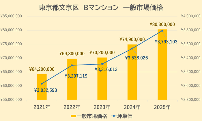 Bマンションの一般市場価格・坪単価の推移は上記【図4】の通りです。