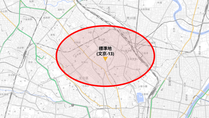 今回は、標準地(文京-13)周辺の下記エリア内のマンション事例①(築10年~19年)、マンション事例②(築20年~29年)、マンション事例③(築30年~45年)を対象に、過去5年の一般市場価格を抽出します。