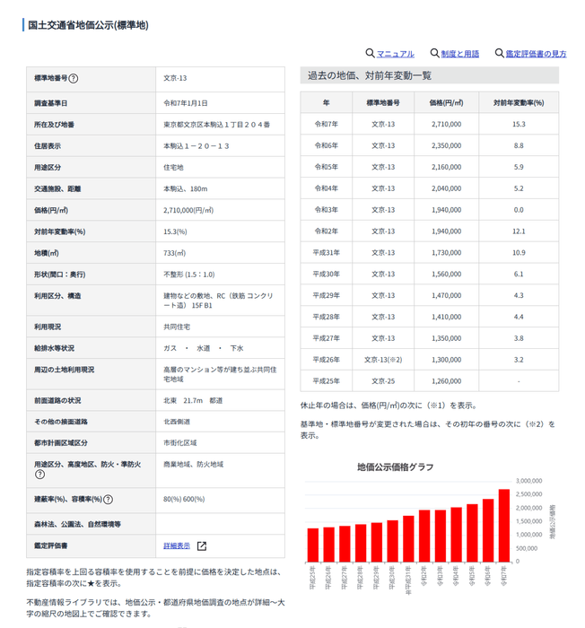 その中で、東京23区内の文京区本駒込(標準地「文京-13」)では、上昇率が15.3%でした。