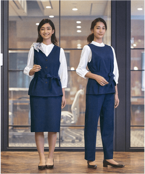 ベスト、プルオーバー、スカート、パンツの4アイテムで着まわすことが可能の為、役割や所属に合わせたコーディネートを選択しながら、企業の親和性も生まれます。
