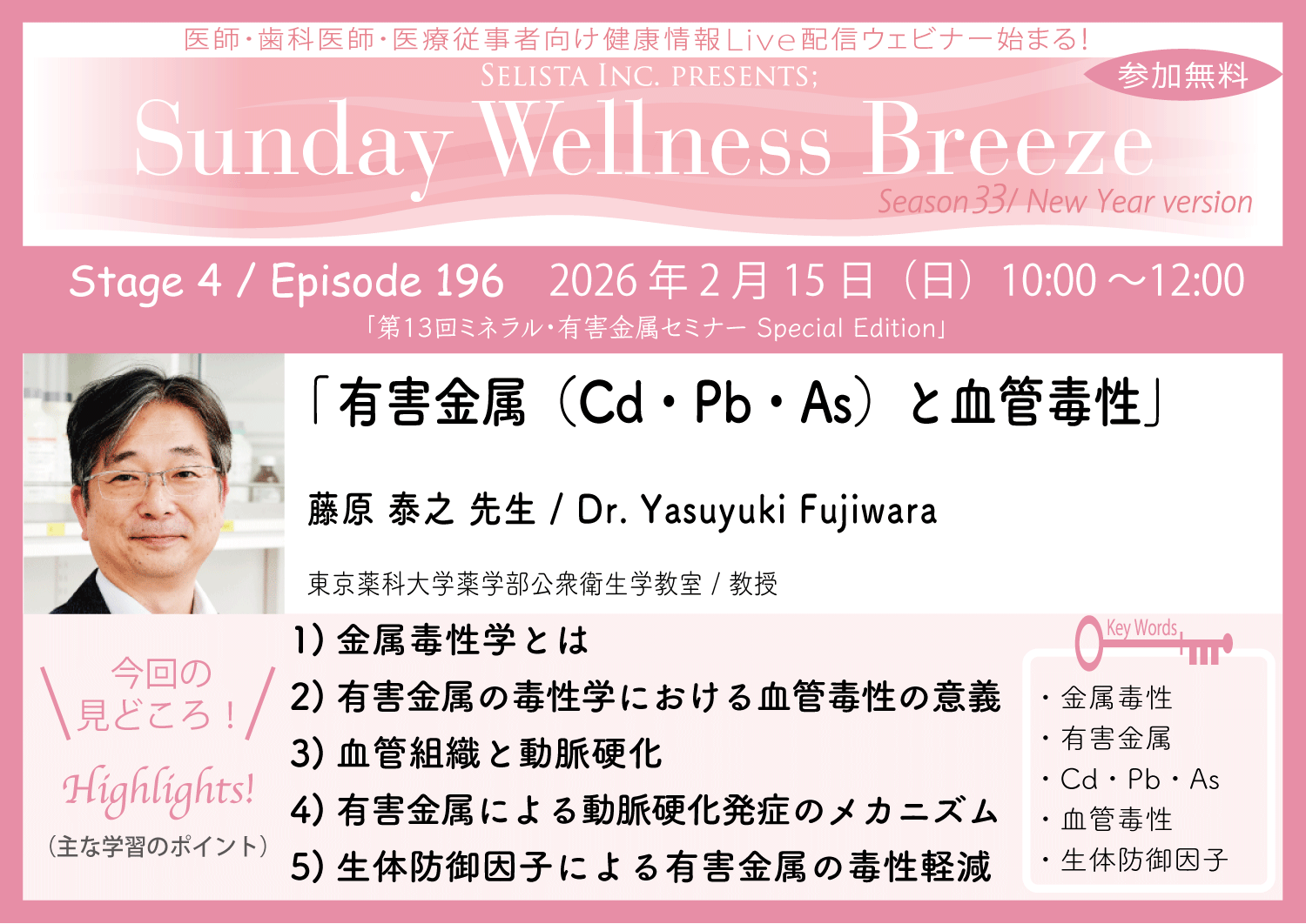 セリスタ株式会社(東京都千代田区 代表取締役:伊藤 承正)は、2026年2月15日(日)に、藤原 泰之 先生(東京薬科大学薬学部公衆衛生学教室/教授)を講師にお迎えし、医師・歯科医師などの医療従事者向け無料Zoomオンラインセミナー『有害金属(Cd・Pb・As)と血管毒性』を開催します。