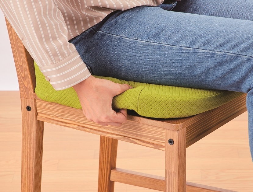 自宅のダイニングチェアに敷くだけでオフィスチェアのような快適な座り心地を実現。ポンプを押すと座面が膨らみ、程よい前傾姿勢に調整できる。