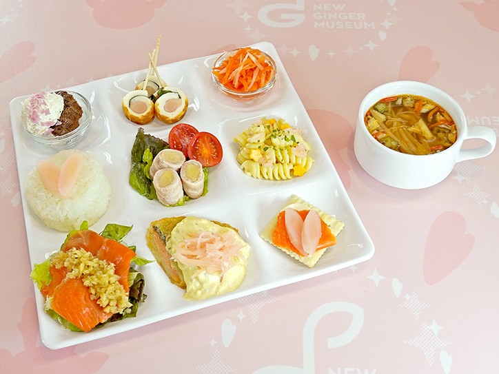 岩下の新生姜をさまざまに使ったオードブル7品とライス、スイーツを盛り合わせたプレートに、トマト仕立てのスープをセットにして提供。今シーズンは、カルパッチョ、フライ、カナッペにサーモンを使用し、サーモンのオレンジ色と岩下の新生姜のピンク色が映える、華やかなプレートに仕立てました。
